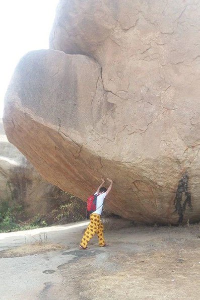 When visiting Hampi, be ready to spend your day exploring temples. There’s a lot, like really a lot, of incredible landscapes to see and unbelievably huge boulders you’ll want to take photos next to. Rachel walked through mazes of boulders wondering how in the hell it all came to be, and when it is your turn, you will be feeling the same. After doing a quick Google search you will find out that geologists state after millions and maybe even billions of years of erosion from rain, sun and wind, the monoliths began to crack, break and fall into what we see today. Still sounds pretty magical!