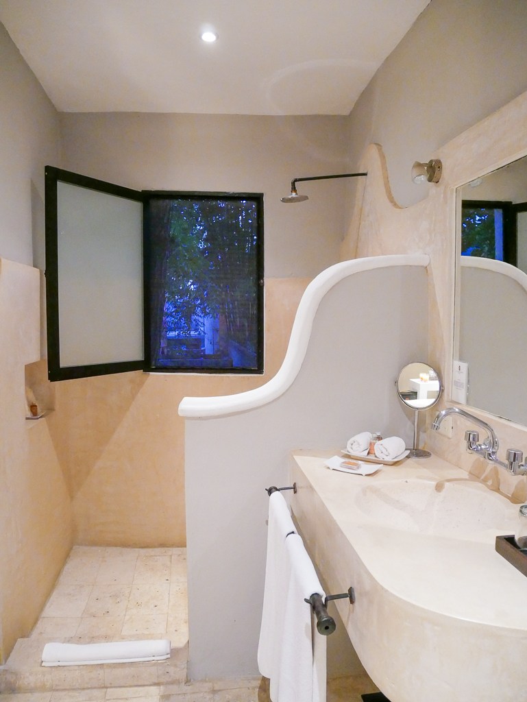 We stayed here three nights when we first arrived and if it wasn’t booked, we would have stayed longer. I wrote a full review here. This is on booking sites and Airbnb, like many boutique hotels in Merida. The room we stayed in was lower level with its own balcony by the pool. The design of this place is a little more simple, not super upscale and is a hotel as well. You will have a key to the front door and to the room. You don’t have a whole house here.