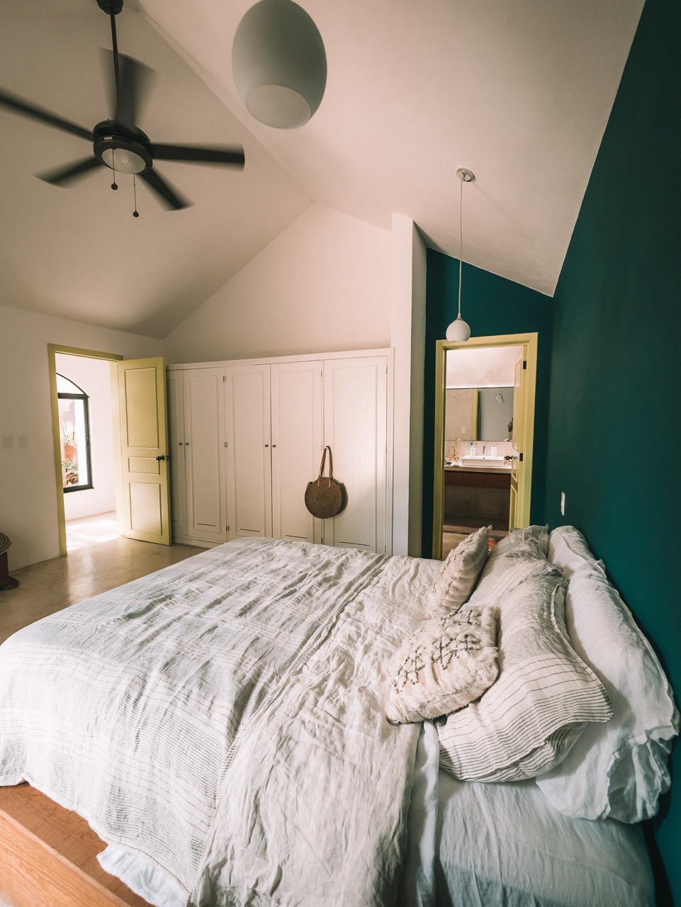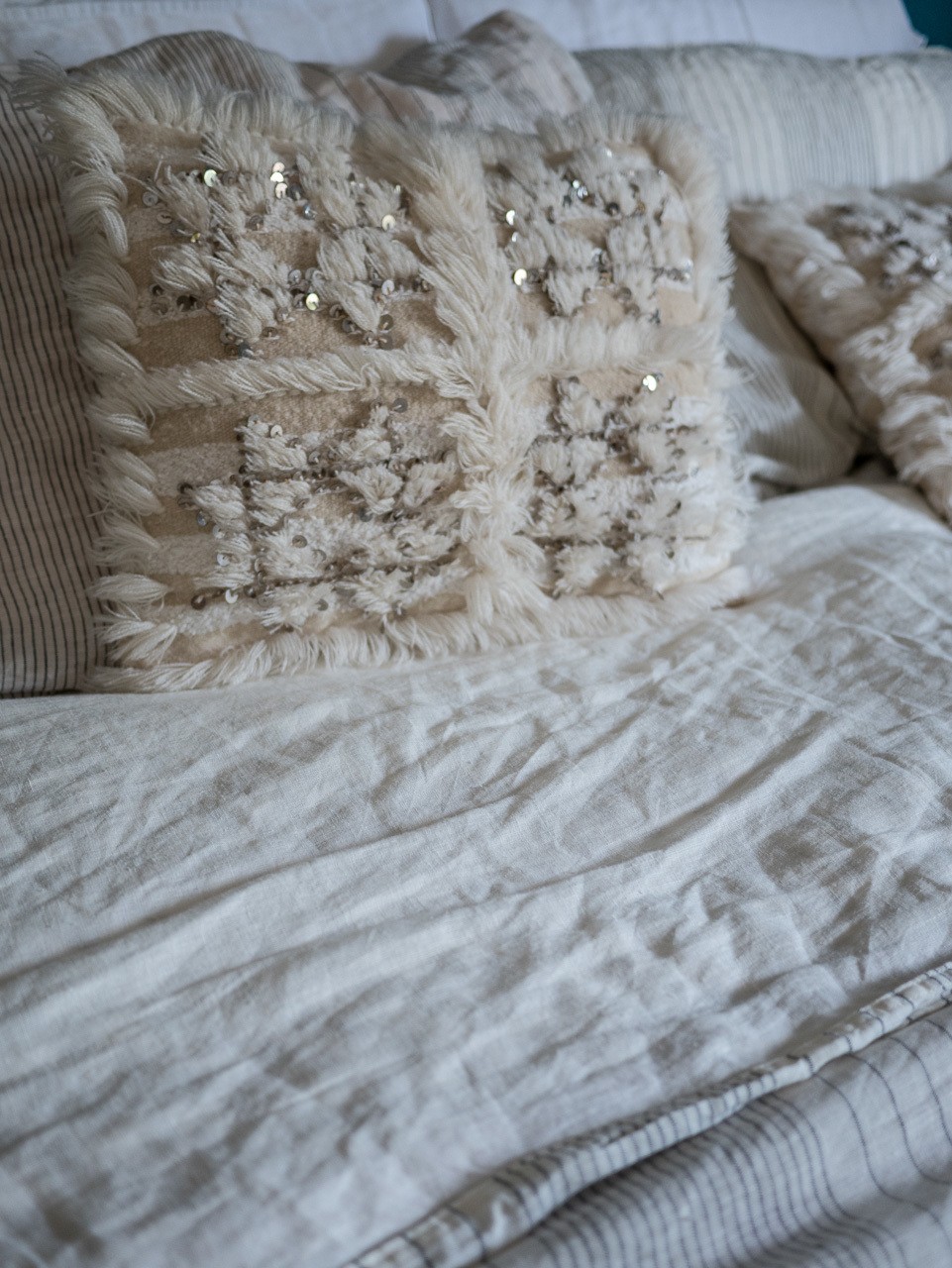 So, since I had to get bedding, I went with Brooklinen linen sheets and duvet covers. I’m obsessed with these sheets. I’m basically OBSESSED with linen. I got a bunch of linen shirts and dresses, too. But, these get softer as you wash them and they are so comfortable. I actually brought my duvet from India, haha! These pillows are from Morocco. I got two sets of sheets and did mixed colors (white with cream and white with striped cream). They are basically “budget” version of supe luxe bedding, but in general linen bedding is always going to be expensive, this is just the best deal.