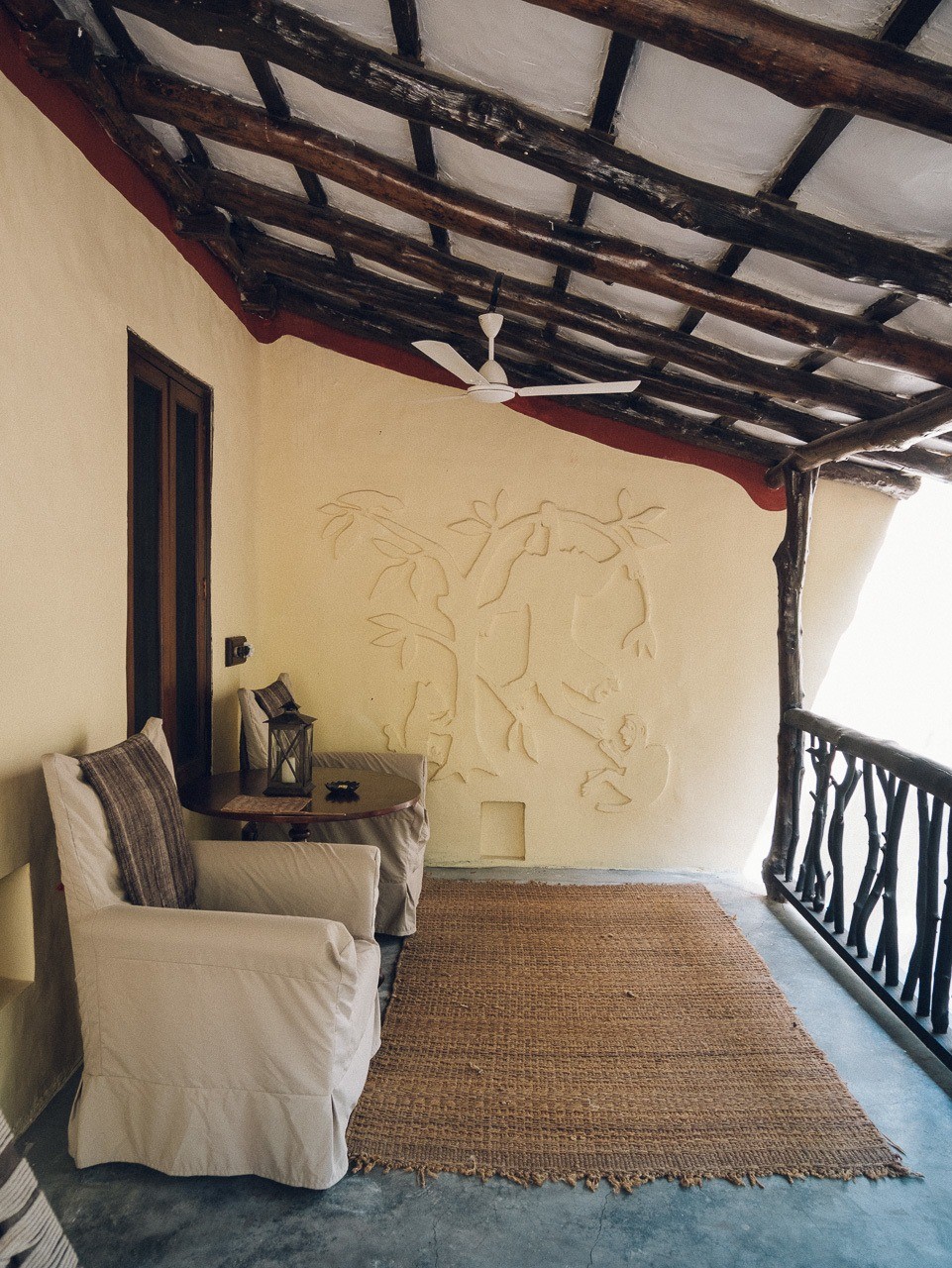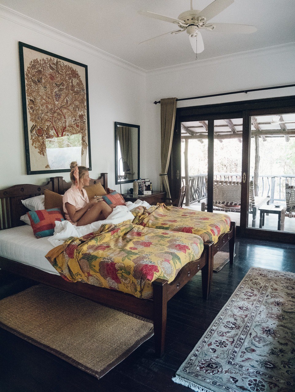 I loved the kantha quilts, hand-woven rugs, and all the traditional Indian touches in the room. I sat on the bed in the morning looking out at the jungle hoping to see a tiger. I didn’t, but it COULD have happened. They have tigers on the property and saw tracks one night while we were there.
