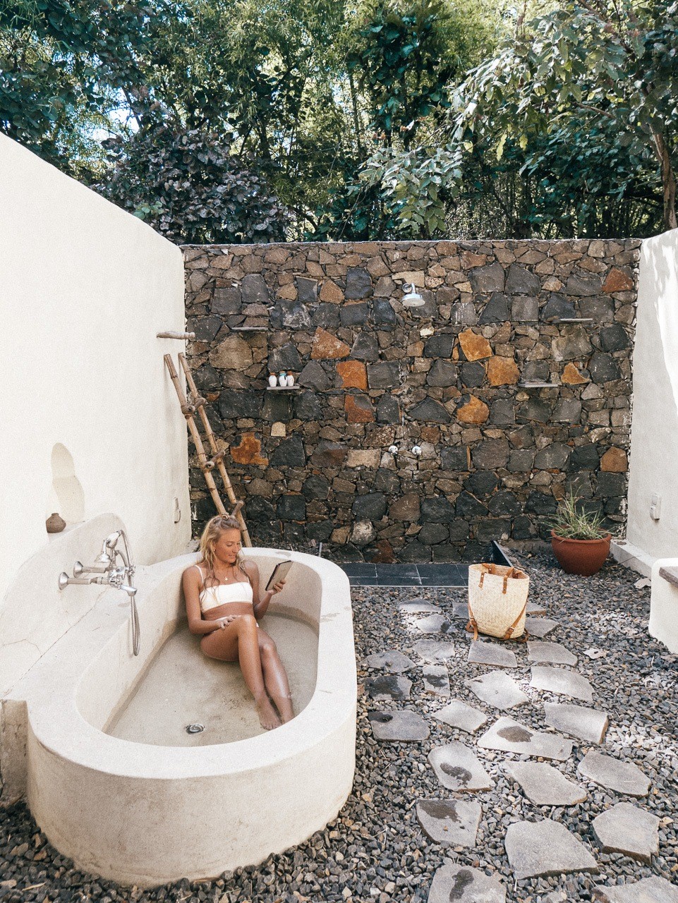 The bathroom was HUGE. There was a shower, bath, and closet, plus two vanities. But then, because one bathroom wasn’t enough, there was a SECOND bath outside! I actually used it like a pool and filled it with cooler water and laid out and got a tan.