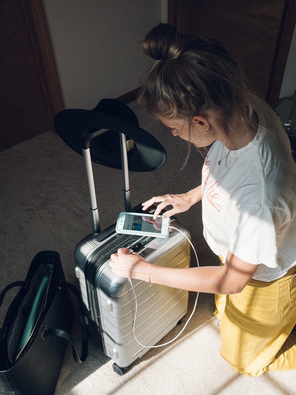 But this new piece of luggage breaks all that up. It’s (truly) the most organized carry-on luggage that I own now. It’s cute, simple, and has a sleek design. I love that it looks so techy with the ribbed mirrored shell. The USB is very clever and it’s just 7 pounds. Not to mention it’s got an additional 1.5 inches you can expand to. It’s 22 inches tall, so really can fit quite a lot.