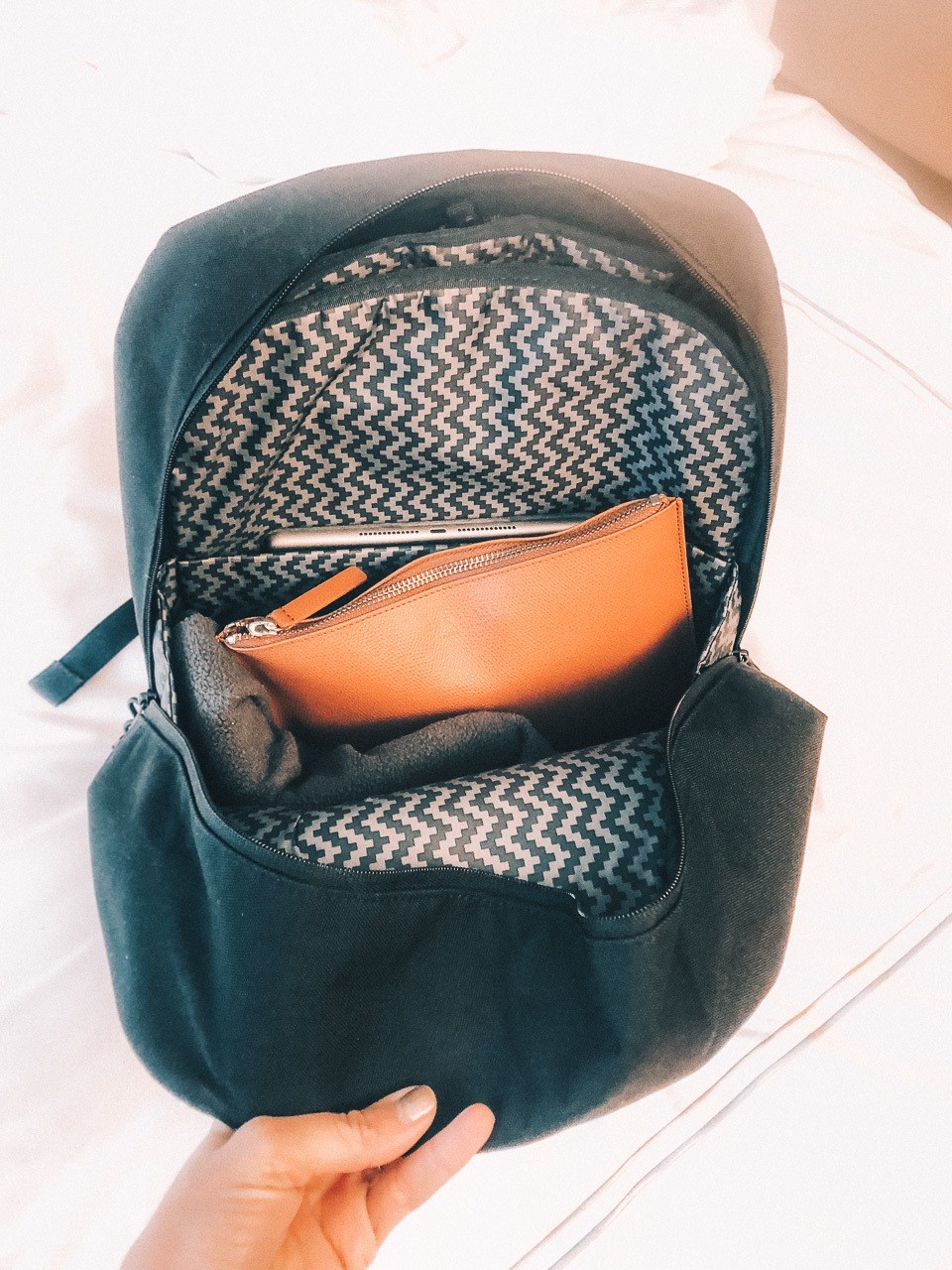 I also love the simple zip leather pouch from Everlane (above) for storing my knickknacks on a plane in my personal bag.