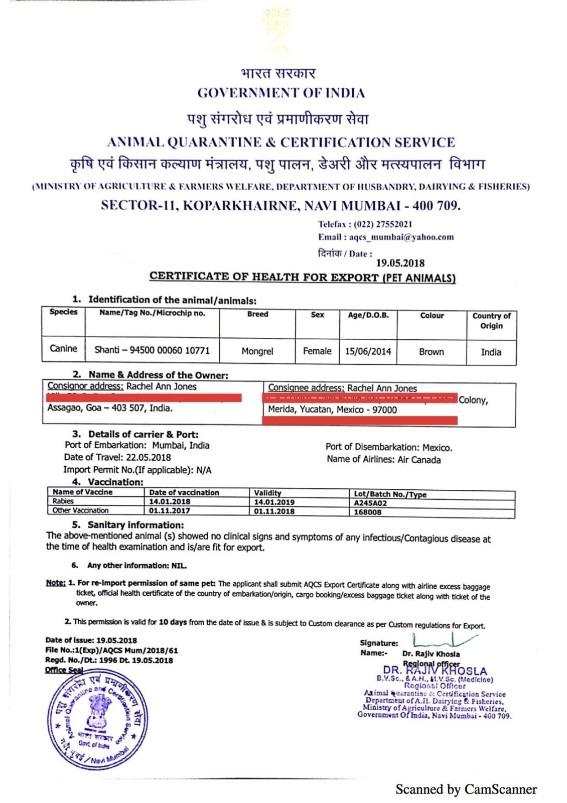 We have completed almost all the paperwork. The last leg of the Animal Quarantine office is balance. I couldn’t help noticing all the documents that you stuck on your dog’s crate. I could make out the following: