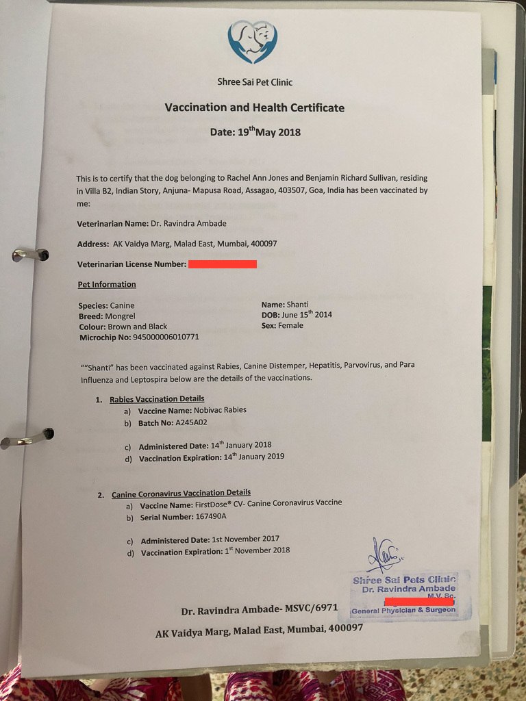 Making sure your pets are up to date on all vaccinations is obviously important so start with this and work with your local vet. We got Shanti in Kerala and she went to multiple two different vets but that is okay.