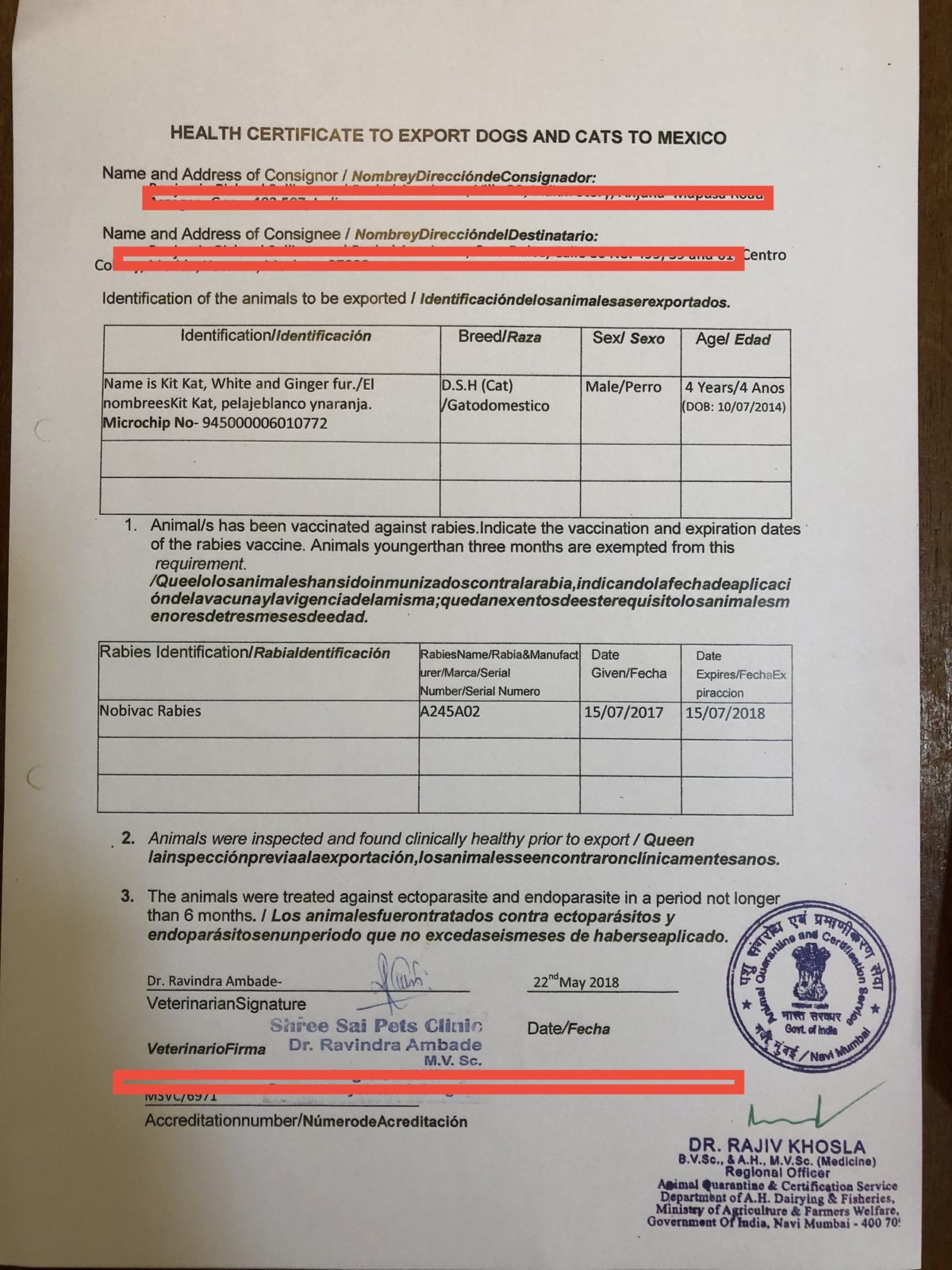 We actually didn’t even need microchips to move our pets to Mexico. We also knew we didn’t need a rabies titer for Mexico, yet he told us he had someone flying to Europe tomorrow and we should send the blood just in case – just a casual 14k rupees per pet for an unnecessary rabies titers. We declined.