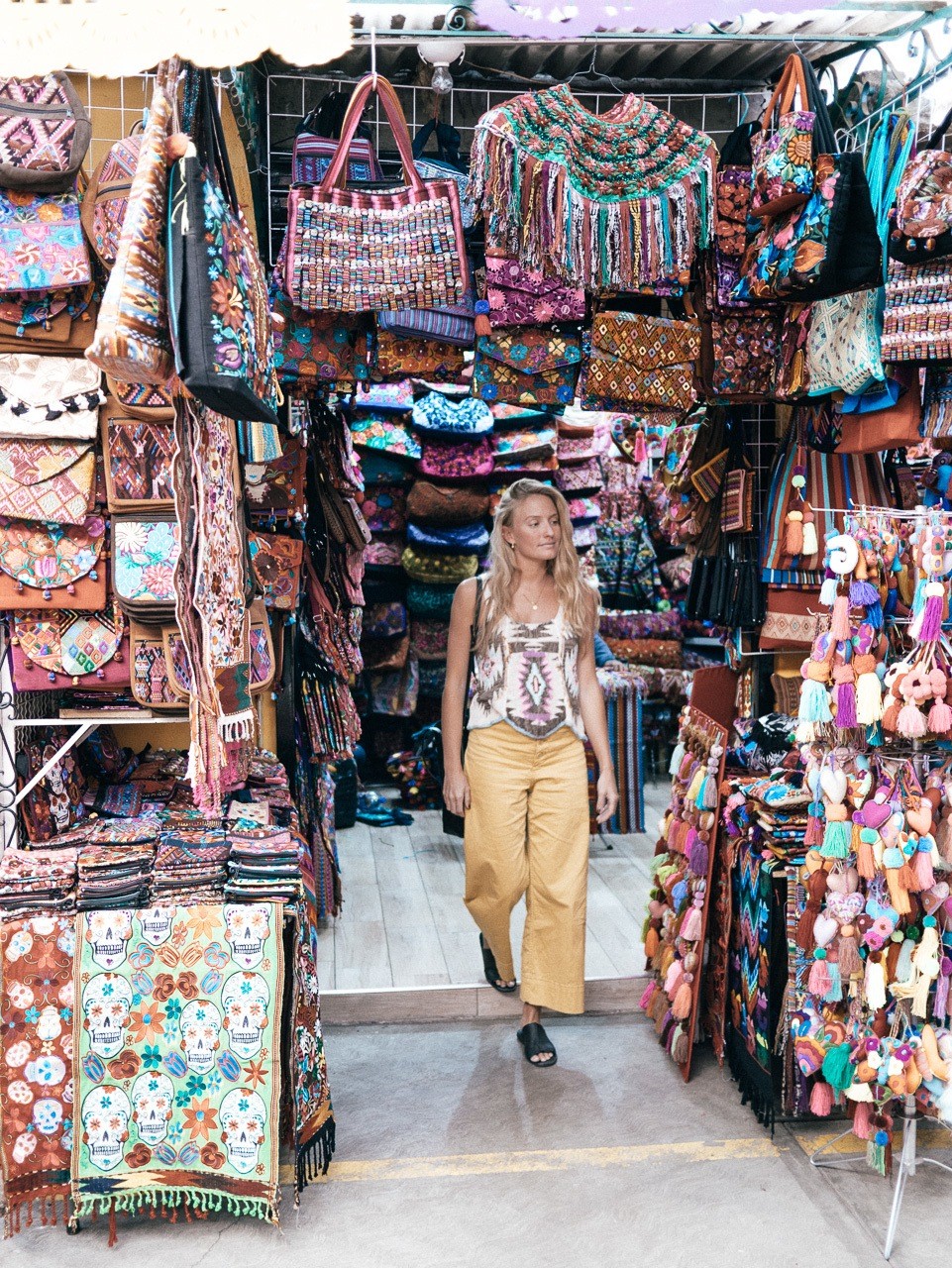 I love this outfit! It was so colorful. I wore the “Pintucked Chino Pant” from Anthropologie. They are a cropped flare and at $110 an investment. But, they are high-quality and always make a go-to outfit for me when I travel. I love the yellow color. The white would also be very cute and Mexico City is very clean and totally okay to wear white pants. I wore an old colorful woven tank from Free People with them. My Madewell tote was perfect for the markets!